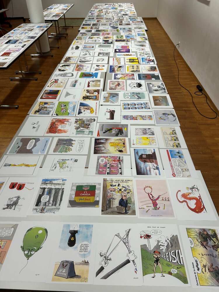 Bedächtig gehen wir im Raum umher. Alles, was die letzten Monate gebracht haben ist nochmals da: Eurovision Song Contest, Frauenfussball Europameisterschaft, Zollstreit mit den USA, Kriege, Wahlen, Abstimmungen. Ein gelegentliches Schmunzeln oder ein unterdrücktes Lachen deutet darauf hin, dass es sich hier um keine alltägliche Aufgabe handelt. Trotzdem ist die Ernsthaftigkeit der Aufgabe spürbar. Da wird sorgfältig abgewogen, hier und da ein Jeton verschoben. Bei keiner Zeichnung liegen zwei Jetons – ohne Absprache ist uns allen klar, dass wir so am meisten Zeichnungen mit in die nächste Runde nehmen können.