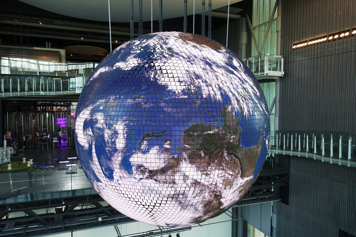 Was mich beeindruckt: Der Mut zur Lücke. In einem riesigen Raum finden wir nichts weiter als eine riesige digitale Weltkugel, die von der Decke hängt. Die mächtige Kugel ist bedeckt mit unzähligen Bildschirmen. Sie zeigen die Erde aus Satellitenperspektive: Kontinente, Ozeane und vorbeiziehende Wolkenbänder, alles dreht sich als Animation langsam um die Achse zwischen den Polen. Darunter liegen die Besuchenden auf Liegebetten. Kein Spektakel, ein Raum für Ruhe und Kontemplation. Mir gefällt das, weil wir die Tendenz haben, alles zu füllen – möglicherweise zu überfüllen. Hier findet man einfach Raum zum Entspannen, ohne Inhalt, den generieren meine Gedanken ganz alleine. Das braucht Mut.